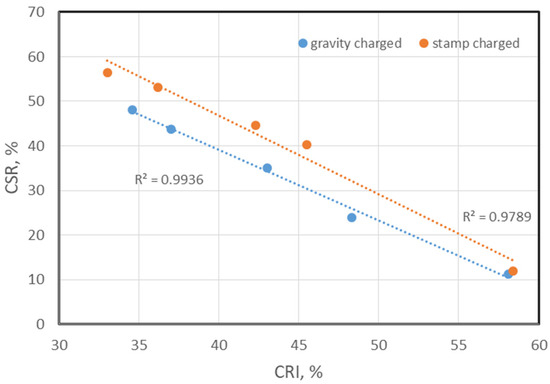 The relations between CRI and CSR presented in Figure 10 are also consistent with the literature [74], but in the described case, it can be clearly observed that for stamp-charged bio-cokes, the CSR values are slightly higher than for gravity-charged, for a constant CRI value (except for 20% charcoal content, where they are practically the same). Higher CSR values for stamp-charged bio-cokes may result from their lower porosity (Figure 5), making them less susceptible to mechanical impacts. The behavior of the sample of 20% charcoal content is not entirely clear where, despite the lower porosity, CSR improvement with increased charge density was not noted. The effect of increased CSR strength for the same CRI value results from the higher density of the charge, which contributed to the reduction in the total porosity of the bio-coke. As it is known, lower total porosity is associated with higher mechanical strength [34,51,52,53]. The increase in the density of the coal charge, apart from the decrease in porosity itself, also causes an increase in the thickness of the pore walls, which also has a positive effect on the mechanical strength. Such a phenomenon was noted in the works of [75,76]. The mentioned parameters also affect the values of TS600 and AI600 (Figure 11). In the case of bio-cokes from the feedstock, a decrease in the tumbling strength TS600 value and an increase in the abrasivity index AI600 were observed. The values of these parameters are more favorable for bio-cokes made from rammed feedstocks, thanks to their higher density and lower total porosity.