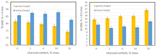 However, the decrease is not as drastic as in the case of CSR. TS600 dropped from 81.6% to 74.3% in the case of the gravity-charging system, while for a stamp-charging system to a content of 10%, the TS600 values are even higher than for the blend without the addition of charcoal. Only for 20% content there was a slight decrease from 85.8% to 82.6%. Obviously, for bio-cokes made from stamped charges, the values are noticeably higher than for gravity-charged ones. In the case of rammed batches, the higher resistance to tumbling may result from the fact, that with the addition of charcoal, a substance with a much lower apparent density, the batches were stamped to maintain an assumed fixed density (which was actually achieved only for 2% of the content—see Figure 2). Therefore, with the increased charcoal content, the compacted charges, despite their lower density, were more compacted—especially the coking coal part. This resulted in an increase in its structural strength, which is reflected in the high TS600 values. Opposite trends were observed in the case of abrasivity index AI600. The noticed value and increase in bio-cokes from the gravity charging system was clearly higher than for bio-cokes from the stamp charging system. Based on the above information, it can be concluded that the obtained bio-cokes were characterized by relatively good cold mechanical properties.