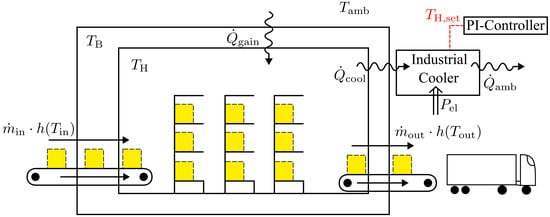 Figure 1 shows an overview of the system. The industrial warehouse was modeled with the thermal capacity of the complete warehouse and a transient energy balance. The thermal capacity is the sum of the internal thermal capacities of the stored cheese products and the thermal mass of the building, where the steel of the high-bay racking is a relevant factor. This is modeled by