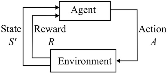 Schematic of agent–environment interface in RL showing the agent, the environment and their interaction via the action, the reward, and the state.