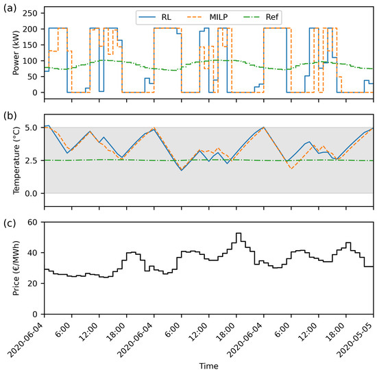 Both, RL and MILP, use low energy prices for the precooling of the warehouse and operate close to the upper boundary of the set temperature. The use of the thermal capacity as energy storage can be seen in the second subplot. The capacity of the industrial warehouse including the stored cheese is so high that the complete temperature band from to is not fully used in these exemplary days. The results of the entire year can be seen in Figure 4.