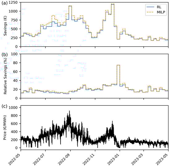 Results for load shifting over the complete year evaluating RL and MILP depending on the electricity price. (a) The weekly energy savings via RL and MILP, (b) the relative weekly energy savings, and (c) the EXAA spot market price for the test period (May 2022 to April 2023).