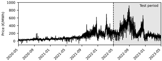 EXAA spot market price from May 2020 to April 2023 showing the electricity prices with its fluctuations. The white area is the training data, whereas the testing period is shaded in grey.