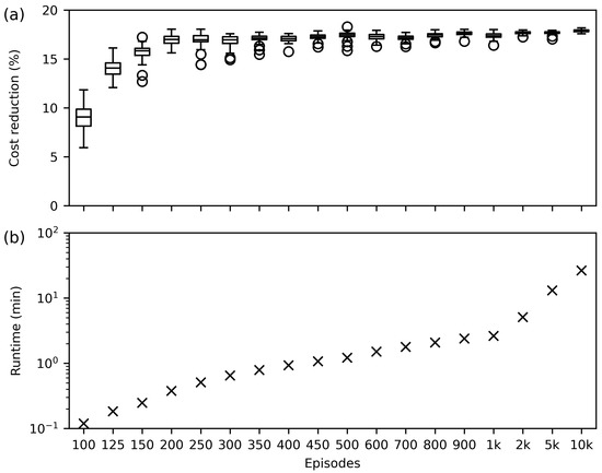 Figure 7 shows that the training process converges and, after 250 episodes, good results can be achieved. However, using longer training periods on average improves the results even further. While 250 episodes average 16.94%, 10,000 training episodes average a cost reduction of 17.87% and the deviation of the results is much smaller.