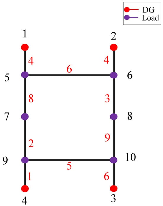 To verify the proposed method, a DC microgrid based on the IEEE 10-bus system is designed, as shown in Figure 1. In this diagram, red nodes denote sources, purple nodes represent loads, and node numbers are labeled in black. The cables are represented by black solid lines, with the resistance values indicated by red numbers.