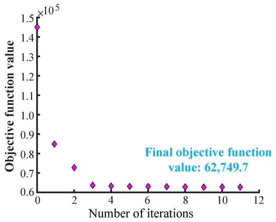 The calculation results from the MATLAB CVX Optimization Toolbox are shown. Here, the CVX built-in optimization solver MOSEK is used to solve, the core algorithm of which is the interior-point method. Results show that the objection function converges to the minimum value 156,708,898.75 and the global solution is
