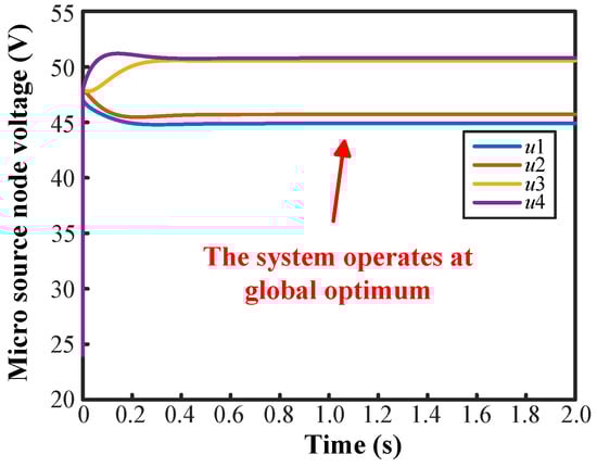 Based on the 10-node DC microgrid system, Figure 3 and Figure 4, respectively, show the voltage waveform of each micro-source node of the system based on the control strategy in this chapter and the comparison control strategy. The simulation results of the system under the distributed control proposed in [14] are presented in Figure 4. In this comparison simulation, only is replaced with , while all other parameters remain unchanged. Simulation results comparing the proposed method and the existing method in [14] are presented in Table 1. Results show that the steady-state voltages of DGs under the existing distributed control are u = [44.9060, 45.7227, 50.5705, 50.8006] V and the objective function is 65,509.4, while it is 62,749.3 in the proposed method. Therefore, simulation results verify that the minimum value obtained proposed method is lower than the existing method.