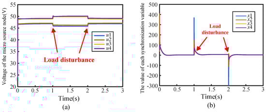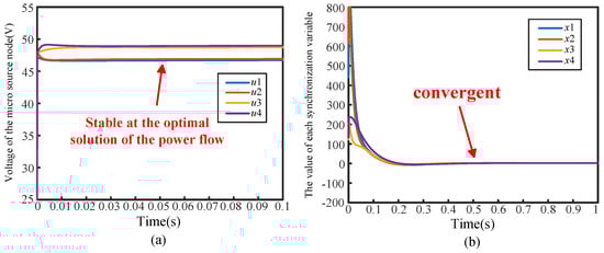 This part is designed to test whether the proposed method can achieve global optimization under load changes. Here, load changes are designed at s and s. As can be seen from the simulation results in Figure 7, when the load changes abruptly, the optimal factors are inconsistent, which means that the system does not work at the optimal point. However, soon the optimal factors resynchronize and the system returns to the optimal operating point. Therefore, the proposed method can achieve global optimization under load variation without re-solving the power flow problem.