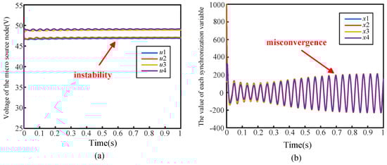 Simulation results for the case ms are presented in Figure 5a shows that the voltage waveforms of each micro-source node show little difference compared to the case without communication delay, indicating that it has no significant impact on the node voltages when . The dynamics of the optimal factors are presented in Figure 5b. It can be seen that the waveforms of the optimal factors exhibit noticeable fluctuations, and they reach the steady-state around 0.8 s, indicating that communication delays will slow down the convergence rate of the proposed method, though they do not affect the steady-state. Hence, simulation results verify that the system is stable if .