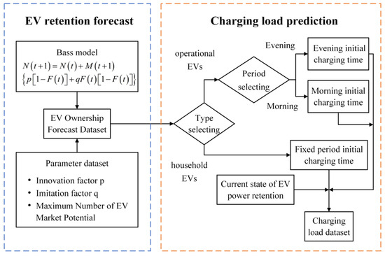 Combining the prediction theory of the Bass model (as discussed in the previous section) with the method for generating the starting charging time introduced in this section, it is possible to obtain a dataset of charging loads that contains the charging information of EV users over different years. The model for predicting the EV charging load is illustrated in Figure 1 [27].
