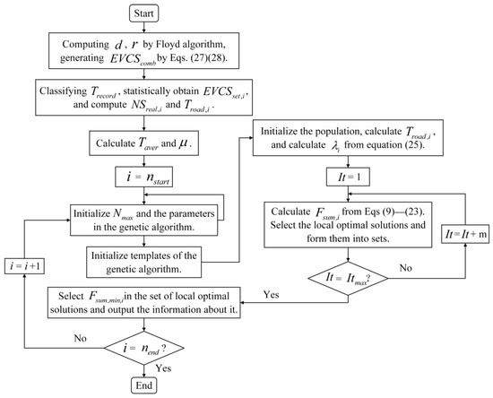 The solution process of the EVCS planning model proposed in this study is mainly divided into two parts: charging user selection and algorithm solution. The corresponding solution flow chart is shown in Figure 2. Compared with previous studies, this model is improved in terms of processing the charging load dataset and the efficiency of the solution algorithm. The charging load dataset is first classified against the existing charging station combination, following which the classified dataset is processed daily when the solution algorithm is running. As this study did not consider the influence of other factors on the travel path changes in EV users, the Floyd algorithm was selected to obtain the shortest path for each network node, followed by classification. The improved genetic algorithm is adopted to solve the algorithm, which uses parallel computation in the iterative process; that is, multi-thread operations are carried out, leveraging hardware to speed up the computation of the algorithm. For the specific implementation of the improved genetic algorithm, see the pseudo-code explanation in Algorithm 1. The specific solution steps of the planning model are as follows: