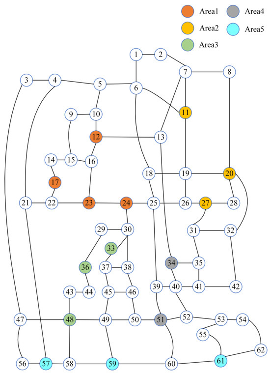 For this study, an area in the main city of Chongqing, China, was selected as an example analysis area. The road network node map of the scheme planning area is shown in Figure 3, which covers an area of 24.318 km2 and contains a total of 62 road network nodes. The EVCS sites were divided into five areas, according to their geographic location. The charging pile type of the EVCS is the fast-charging pile with a charging power of 120 kW, the battery capacity of the operational and domestic vehicles is 60 kWh, the power consumption is 15 kWh/100 km, the total range is 400 km, and the average speed of the vehicles is 30 km/h. The rest of the specific parameters regarding the planning of the EVCS are shown in Table 2 [28,29,30]. Based on the results of previous studies, was set to 5 and to 12. Furthermore, , , , and were set based on [26].