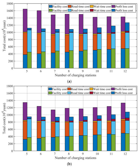 The above results demonstrate that, in the case of rapid EV market expansion, the use of the improved planning strategy can significantly improve the future profitability and utilization rate of charging piles; meanwhile, in the case of slow EV market expansion, the utilization rate of charging piles in the original planning strategy is obviously better than that in the improved planning strategy. In this case, if the utilization rate of charging piles is preferred, then the original planning strategy is a good choice.