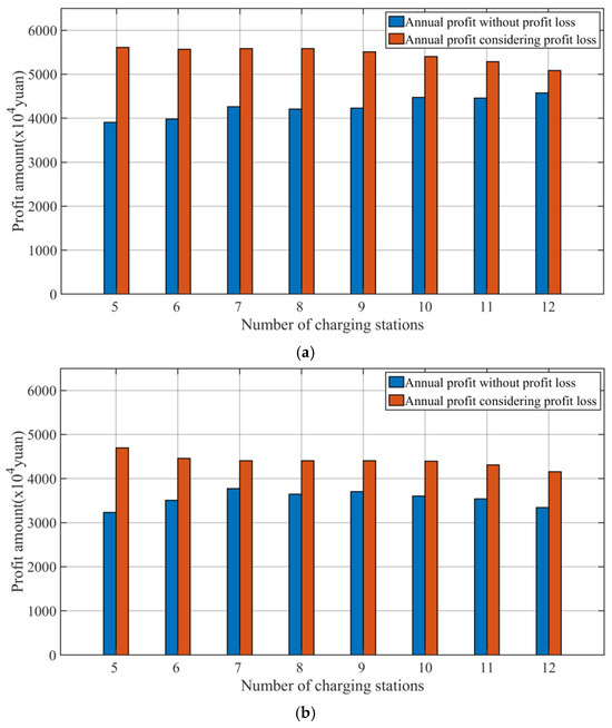 Annual profit of EVCSs under different scenarios: (a) Scenario 1; (b) Scenario 2.