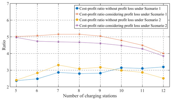 The cost–profit ratio of all planning schemes is determined by calculating the ratio of net profit to annual comprehensive cost for each planning scheme in Figure 5 and Figure 6, as shown in Figure 7. The cost–profit ratio was used as the selection criterion for the EVCS planning scheme, and the optimal planning scheme for the EVCSs under both circumstances was finally selected, as shown in Table 3. Comparing the results presented in Table 3, it is evident that, under Scenario 1, the annual comprehensive cost of the EVCS planning scheme with the improved planning strategy is reduced by 24.25% and the net profit is increased by 22.14% when compared to the traditional planning scheme. Similarly, under Scenario 2, the annual comprehensive cost of the EVCS planning scheme with the improved planning strategy is reduced by 16.93% and the net profit is increased by 24.49% when compared to the traditional planning scheme. In Table 3, under the same conditions, the number of EVCSs is reduced when using the improved planning strategy and, in the case of a low oil price, the number of EVCSs is reduced to the lower limit of the number of target planning areas. Additionally, the configuration of charging piles becomes more centralized, indicating that the strategy of centralized planning is beneficial for increasing the utilization rate of charging piles in EVCS, which aligns with the conclusion drawn from the charging load analysis under Scenario 2.
