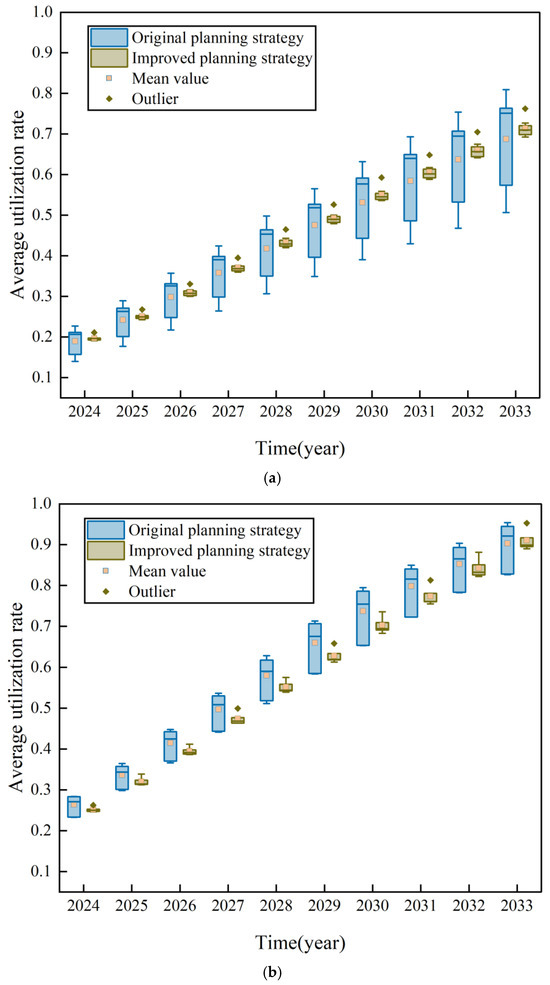 The average utilization rate of charging piles under the selected planning scheme from 2024 to 2033: (a) Scenario 1; (b) Scenario 2.