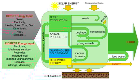 The results of archaeological research conducted in various parts of the world indicate that the history of agriculture spans at least 12,000 years since various nomadic tribes began a sedentary lifestyle and mastered the ability to cultivate several basic plant species and raise animals [1]. The transition from gathering and hunting to agriculture as the primary means of obtaining food was crucial to the emergence of the first civilizations, and agriculture became the main source of energy and materials for preindustrial societies [2,3]. Agriculture can thus be seen as the first energy generation sector ever developed by man [3]. Sources of energy used in agricultural production processes in the preindustrial era were mainly organic inputs based on solar energy (biomass) and animal pulling power (fed with biomass) [2,4]. As part of the photosynthetic processes, the energy of the sun’s radiation was converted in a targeted manner into energy contained in food, feed, and fibers (i.e., biomass) [5]. The Industrial Revolution changed this situation; fossil fuels and minerals became the main source of energy and materials for people [2,6,7]. Also, in agriculture itself, with industrial development, inorganic inputs (fertilizers, machinery) and energy based on fossil fuels have taken over the dominant role in food production processes [2,4], and agriculture has gone from being an energy producer to a significant energy consumer, dependent on fossil resources [3,5,8].
