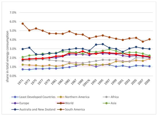 It is estimated that in the category of direct energy cost, the share of agriculture in final energy consumption is at about 3%, while the share of the entire agri-food sector is already at about 30% [55]. In the EU, it is also 3% on average, but there are significant differences between countries in this regard—for example, in the Netherlands, it is over 9%, and in Slovakia, it is 1.3% [96]. A slightly smaller average share of agriculture in global energy consumption (directly) is indicated by FAO data (Figure 2), which shows that the global share of agriculture and forestry in 1971–2009 did not exceed 3%, but the situation varied strongly, on average, between world regions. By far, the narrowest share throughout the observation period occurred on average in South America (variation in the range of 4–6%). On the other hand, the lowest was observed in developing countries and North America. It is also worth noting that the indicator in question grew quite steadily until the early 1970s, after which a slight downward trend began (mainly in Europe and South America). When analyzing the changes in the share of agriculture in energy consumption, it should be remembered that they are also the result of changes in energy consumption in other sectors of the economy.