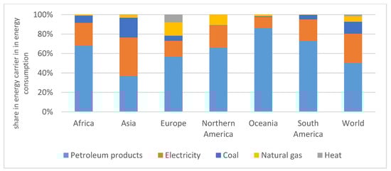 Figure 4 shows the changes in the absolute level of consumption of direct inputs (energy carriers) that took place in world agriculture over the period 1990–2021. In general, one can observe a marked increase in electricity consumption with a slight downward trend in the consumption of petroleum products and little change in other energy carriers. It is worth noting that during this period, for example, grain production increased from 1.95 bln to 3.07 bln tons (an increase of 57.4%) and population from 5.33 bln to 8.02) (an increase of 50.4 %) [102]. This suggests that the increase in demand for energy carriers was less than the increase in population and agricultural production (similar increases occurred in other product categories). Figure 5 represents the structure of energy carriers used in agriculture. The figures show that the most important agricultural energy carrier is petroleum products (diesel), accounting for about half of energy consumption. However, the situation in this regard varies somewhat between regions. The second most important energy carrier for agriculture is electricity. This structure is essential from the point of view of the possibilities of energy production by agriculture, as one can ask which types of renewable energy sources produced by agriculture can be a substitute for the energy carriers indicated in Figure 3.