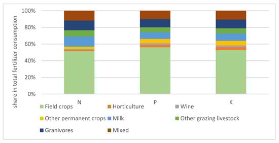 Another data source for estimating the structure of agricultural energy consumption in the EU, for example, is FADN (Farm Accountancy Data Network). This database does not contain detailed information on energy inputs in physical units. Still, it contains highly detailed cost data, which indirectly makes it possible to assess the energy consumption structure. Table 2 shows the results of a review of FADN data [115] indicating the structure of energy costs incurred in EU agriculture. These data refer not to specific agricultural activities but to production types of commercial farms. Given that some of these types include specialized farms, it is possible to indirectly infer the activities that are most and least energy-intensive from the point of view of the entire sector (which is vital for energy and agricultural policy). The presented summary is based on the direct costs of energy carriers and the basic groups of indirect energy consumption, i.e., fertilizer and feed costs. The compilation shows that at the sector’s scale, the largest share of total energy costs is accounted for by farms in the “field crops” type, which account for almost one-third of energy consumption (energy costs). Considering economic size (measured by standard output), it can be seen that the largest farms dominate this comparison. The second-largest farms in the total share of energy costs were those in the dairy type, accounting for 16.7% of energy costs, followed by farms in the “mixed” type. The largest farms were responsible for most of the energy costs in each farm type. Figure 6 presents the share of each production type in fertilizer costs, which, as the previous information shows, is the main item in indirect energy consumption. Considering the energy needed for fertilizer production, the nitrogen share reflects the energy consumption structure. The presented figure demonstrates that, as in the case of direct energy costs, farms in the “field crops” type are dominant, consuming approximately more than half of the fertilizers used in EU commodity agriculture. The next places in the ranking thus established are occupied by dairy and mixed farms, but their consumption share is several times smaller.