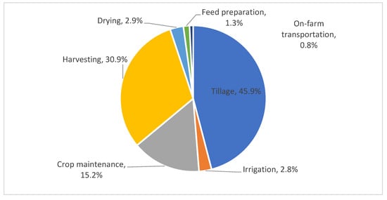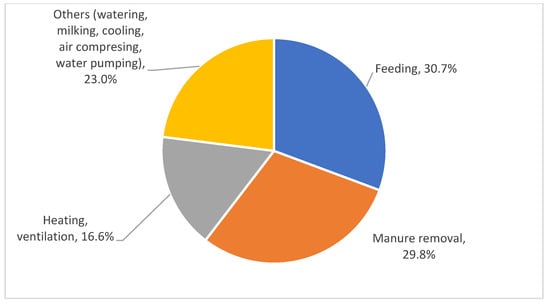 The results presented in Figure 8 indicate that plowing is the most energy-intensive operation, accounting for about 46% of total diesel consumption in crop production. In second place was harvesting (just over 30%), and in third place was crop maintenance (responsible for just over 15% of direct energy costs in crop production). The combined share of the three activity groups mentioned thus exceeded 90%. Also, in the case of crop production, the cited analyses indicate the dominance of several basic activities in the direct cost structure. “Feeding” and “manure removal” had the most significant and similar shares (both categories around 30%). Nearly half the share was for “heating and ventilation” (about 16.6%) (Figure 9). The share of other activities (watering, milking, air compression, cooling, water pumping, and others) was about 23%. It should be stressed, however, that the cited estimate refers to EU-wide averages, and there may be significant differences between regions [116].