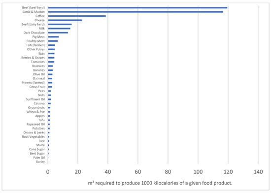 Land use in square meters (m2) required to produce 1000 kilocalories of a given food product (a proxy of energy inputs). Source: [121] (additional calculations by Our World in Data (license CC BY)).