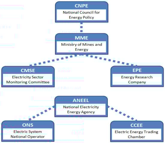 The Brazilian energy sector underwent structural reforms in 2004 with the introduction of the auction system for energy contracting [,]. These reforms divided the Brazilian market into two environments: Regulated Contracting Environment (RCE) and Free Contracting Environment (FCE) []. In FCE, only the so-called free consumers could buy energy. Under these conditions, commercial relations are freely agreed upon and governed by contracts that establish deadlines and volumes. In RCE, purchases and sales occur through auctions with the lowest electricity price, where purchases are restricted to energy distribution companies []. However, the auctions have been limited by the lack of transmission infrastructure in Brazil [,,,]. The leading institutions that compose the Brazilian regulated market are outlined in Figure 1.