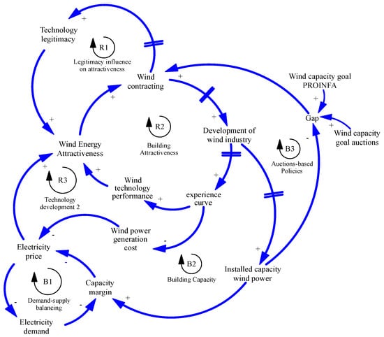 This section provides a detailed explanation of the system dynamics model used in this study. We begin by presenting a conceptual model, known as a causal loop diagram (CLD), which illustrates the overall structure of the system and its key relationships []. CLDs are widely used to visualize the dynamic behavior of a system by mapping feedback loops and time delays. This CLD captures the crucial feedback mechanisms that drive the hypothesized behavior of the wind power sector in response to policy interventions. Understanding these feedback structures is essential for assessing the impact of energy policies and strategies on the system’s performance. Drawing on insights from previous research on wind power transitions [,,,], the CLD was specifically designed to illustrate how auction-based policies influence the dynamics of the wind industry.