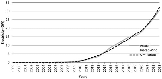 A historical test was conducted to validate the results of the simulation model, following the methodology described by Sterman []. The data used for validation were obtained from ABEEólica [] and the National Electric Energy Agency [], covering the period from 1999 to 2023. The installed capacity of wind power and electricity demand served as the primary variables for the validation process.
