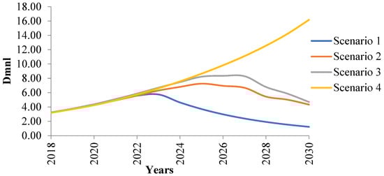 The second scenario shows that when there are insufficient wind auctions, but the transmission capacity is suitable, the effect of unsynchronised policy positively affects legitimacy. This trend arises from the lack of constructed transmission lines or insufficient wind reserve auctions, as observed in Scenarios 1 and 2. Additionally, an increase in solar power due to the low cost of panels could influence the technological legitimacy of wind power, causing a noticeable decline starting in 2026. This situation arises when policymakers react with considerable delays to systemic problems, which may negatively affect wind industry expansion [,].