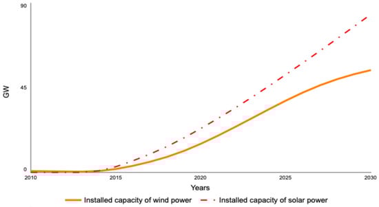 The simulation model considered four sectors, including the installed capacity of both solar and wind power. It also accounted for other energy sources, such as hydroelectricity and biomass. The main assumptions and inputs in the model are as follows: