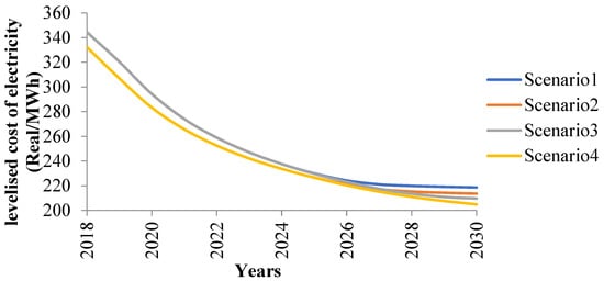 - Scenario 1: business as usual (BAU). This scenario represents the cancellation of auctions and delays in transmission infrastructure (business as usual, BAU). The scenario also reflects the growth of solar power in Brazil due to the decreasing cost of solar panels []. Recently, incentives from solar auctions policy have helped the solar market share surpass that of wind power. This scenario was used as a baseline case against the following ones.
