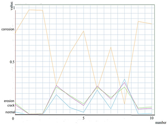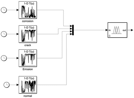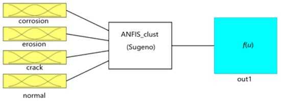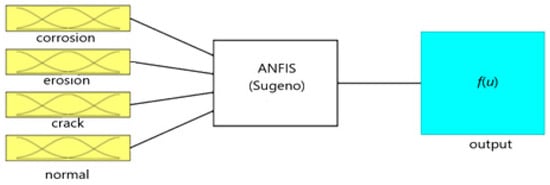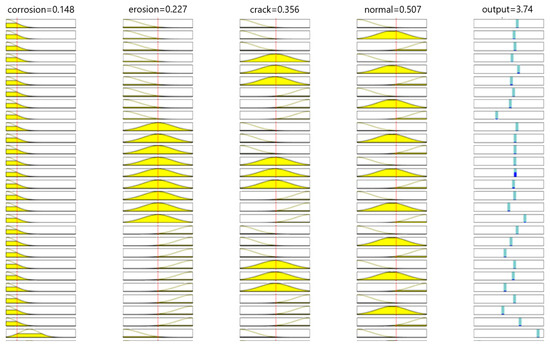The fuzzy system generated by grid partitioning has four variables at the input: corrosion, erosion, crack, and normal, which are given by data in the range [0;1]. That demonstrates the probability of the presence of each of the defects in the image. The general scheme of the generated fuzzy system is presented in Figure 4.