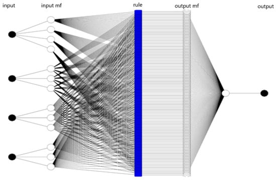The learning process usually starts with defining the input data and dividing it into fuzzy sets. This is done using membership functions. Next, a set of “If …, then …” rules are formed, which connect these fuzzy sets with the expected initial data [52]. Once the system is configured, it goes through a learning process. This means that the system receives inputs along with known outputs and uses them to adjust its parameters. Basically, the neural network learns from this data and gradually improves the accuracy of the system by changing the weights or parameters of the membership functions to reduce the difference between the predicted and actual results.