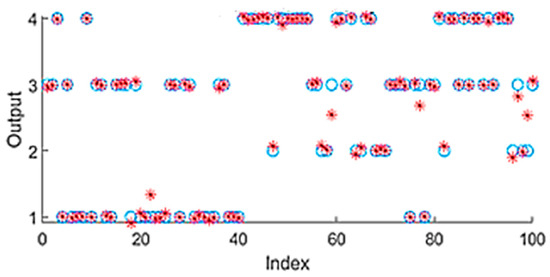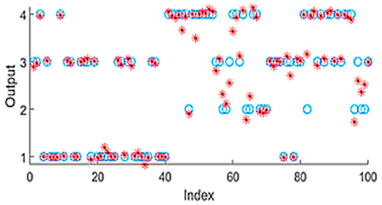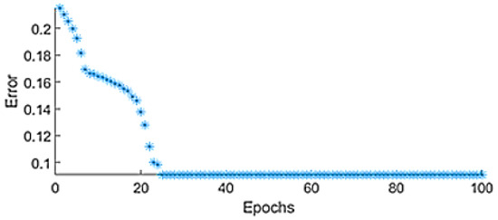 The learning process of the neuro-fuzzy system based on the fuzzy system generated by the grid partitioning method is shown in Figure 10. The training result for 100 epochs showed an accuracy of about 82%.