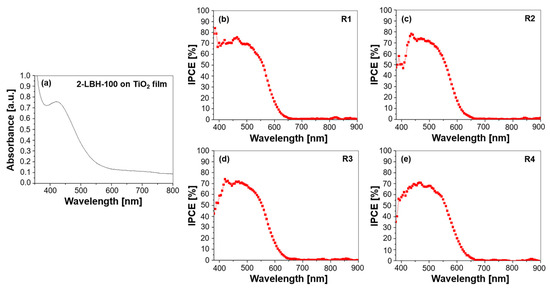 (a) UV–Vis absorption spectrum of the 2-LBH-100 phenothiazine dye adsorbed on a TiO2 film and IPCE spectra for DSSCs employing 2-LBH-100 with various electrolytes: (b) R1—DMPII, (c) R2—DMPII + PVH70, (d) R3—DMPII + PVH80, and (e) R4—DMPII + PVDF-HFP.