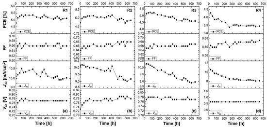 Stability study of 2-LBH-100 DSSCs measured under ambient conditions for over 600 h. Performance of (a) a liquid DMPII electrolyte-based DSSC (R1) and of QsDSSCs employing PVDF-HFP-based gel electrolytes with varying molecular weights: (b) R2—DMPII + PVH70, (c) R3—DMPII + PVH80, and (d) R4—DMPII + PVDF-HFP.