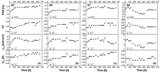 Stability study of 2-LBH-44 DSSCs measured under ambient conditions for over 600 h. Performance of (a) a liquid DMPII electrolyte-based DSSC (R5) and of QsDSSCs employing PVDF-HFP-based gel electrolytes with varying molecular weights: (b) R6—DMPII + PVH70, (c) R7—DMPII + PVH80, and (d) R8—DMPII + PVDF-HFP.