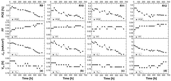 Stability study of 2-Ryu-4 DSSCs measured under ambient conditions for over 600 h. Performance of (a) a liquid DMPII electrolyte-based DSSC (R9) and of QsDSSCs employing PVDF-HFP-based gel electrolytes with different molecular weights: (b) R10—DMPII + PVH70, (c) R11—DMPII + PVH80, and (d) R12—DMPII + PVDF-HFP.