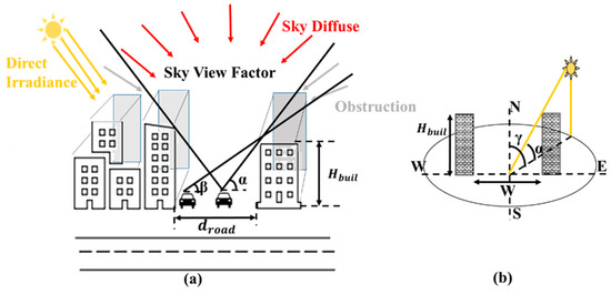 Since there is no correlation between the sun position and the car direction, it is further assumed that the diffuse irradiance is isotropic and depends only on the sky view factor, which represents the visible fraction of the sky. This dependency excludes factors like sun position, latitude, time of year, and street orientation. The irradiance losses can then be estimated based on the sky view factor, obstruction angle, and height–width ratio. In this study, we assumed an urban area close to obstructive sources such as buildings and trees, as depicted in Figure 1, assuming an infinite urban canyon with a specific orientation. For the sake of simplification, mean values were assumed for the height of buildings (), road width (), vehicle width (), and height (). The following values were used: h_buil of 17.5 m and d_road of 15 m [12,33].
