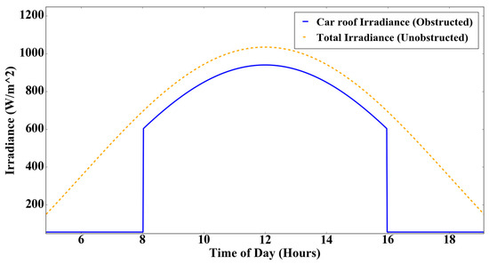 Comparison of irradiance on a vehicle’s roof in an obstructed environment versus an unobstructed surface.