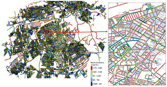 Spatial distribution of road irradiance in Fez: high solar potential on major roads and lower solar potential on small and dense ones.