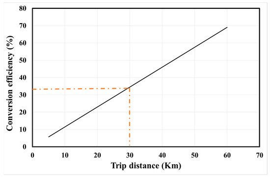 Once the solar irradiance captured by the car has been defined, to guarantee the effectiveness of the system, it is essential to have a high electricity conversion efficiency that can power the vehicle for longer distances than the average daily trip. A calculation of the trip distance dependency on the conversion efficiency was conducted to estimate the required conversion efficiency of the system. Our calculations assumed that an MCPV system with dimensions of 2 m × 1.2 m was installed on a Dacia Spring car. Figure 4 illustrates the relationship between the trip distance and the conversion efficiency. The calculation was based on the following equations:
