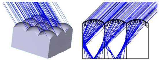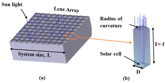 Our system’s modeling, design, and performance evaluation were carried out using Zemax Software (V.13). To achieve full coverage of the EV roof, a rectangular array of 200 × 120 lenses was required. However, for time saving and simplicity’s sake, the simulation was performed on a 10 × 10 array with optical power detectors strategically positioned at the focused areas. The simulations were also based on the use of the irradiance data of the studied region in order to realistically model the efficiency of our system. Furthermore, the simulation accounted for various optical losses, such as Fresnel reflection losses and material absorption. However, certain losses that occur in real-world conditions, such as misalignment between optical elements, impurities in optical material, and degradation, were not accounted for in the simulation. These factors will be taken into consideration in future work when developing the prototype and conducting experiments.