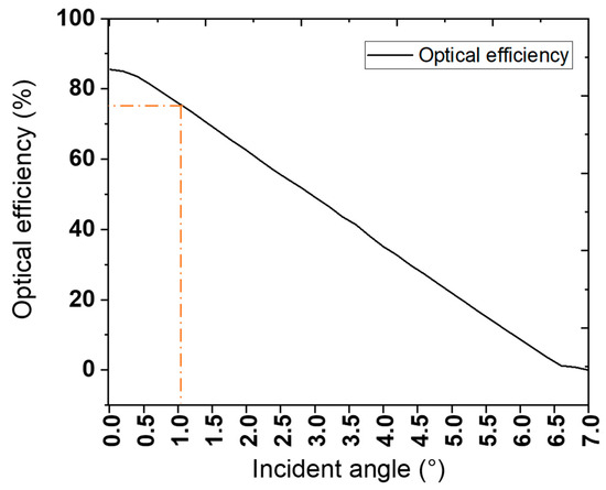 Our proposed system showed an optical efficiency of 85.53%, as demonstrated in Figure 7, which displays the simulated optical efficiency as a function of the incident angle. The results show that an increase in incident angle leads to a decrease in optical efficiency, as some sunrays are not captured by the optical system. Furthermore, the acceptance angle, which is defined as the angle at which the output power decreases to 90% of the optical power measured at normal incidence (0°), is approximately 1° for our system.