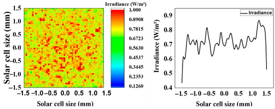 Meanwhile, the irradiance distribution uniformity is generally determined in terms of variation in the value of a quantity Peak-to-Average Ratio, or PAR, which is defined as the maximum irradiance divided by the average irradiance of the cell surface. In our case, the PAR was around 1.2. The distribution of irradiance over the surface of the cell was non-uniform, as certain areas exhibited peaks while others had lower levels, as shown in Figure 8, where the irradiance distribution is presented.