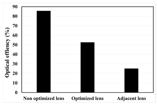 The optical efficiency obtained at a 45° incident angle with different lenses—the non-optimized lens, the optimized one, and the adjacent one—to check the rays missing from the optimized lens that were captured by the adjacent lens.