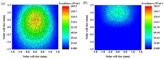Irradiance distribution across the cell surface (a) and its adjacent cell (b) for the optimized structure.
