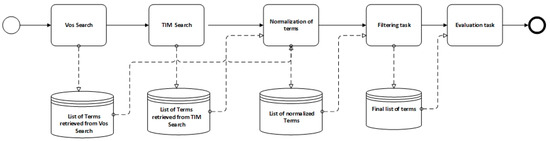 The filtering procedure relied on a semantic dictionary. The construction of this dictionary started with the definition of an initial set of 102 keywords/terms obtained through a preliminary bibliographical review, considering the authors’ knowledge in the area. Subsequently, a semi-automatic approach [36], depicted in Figure 3, was employed to augment and refine the semantic dictionary. This comprehensive process improved the dictionary’s accuracy and completeness, enhancing confidence in the overall filtering procedure.