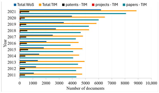 The evaluation of the literature on technology innovations was carried out annually to track the temporal progression. Thus, the search string was employed with the WoS and TIM search engines for each year between 2011 and 2021. Figure 2 shows the results, revealing 87,212 documents retrieved from the databases, with 59,411 originating from TIM and 27,801 from WoS. It is worth noting that there is a consistent upward trend in the number of documents retrieved each year, particularly in scientific papers, indicating an evident growth in the literature.